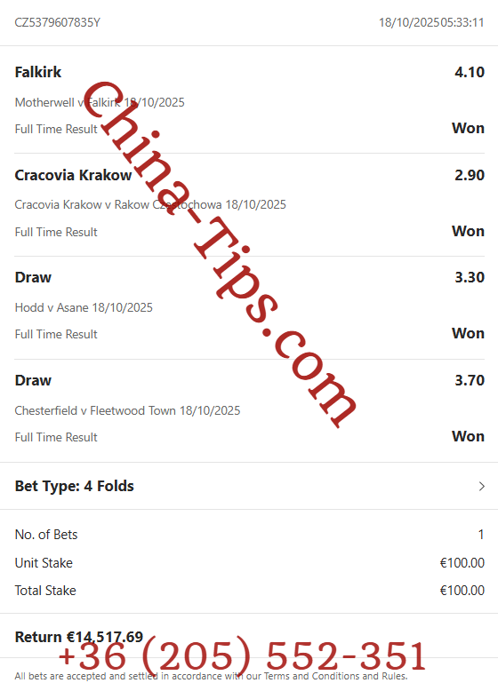 | 18/10/2025 | Chesterfield vs Fleetwood | X | 3.70 | 1 – 1 |